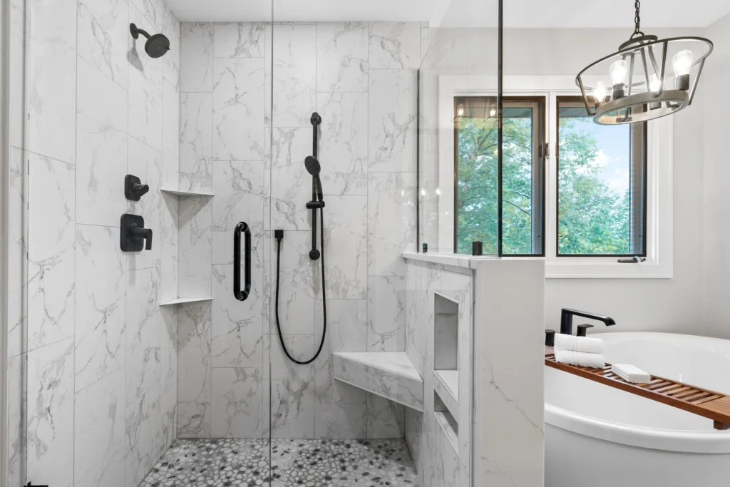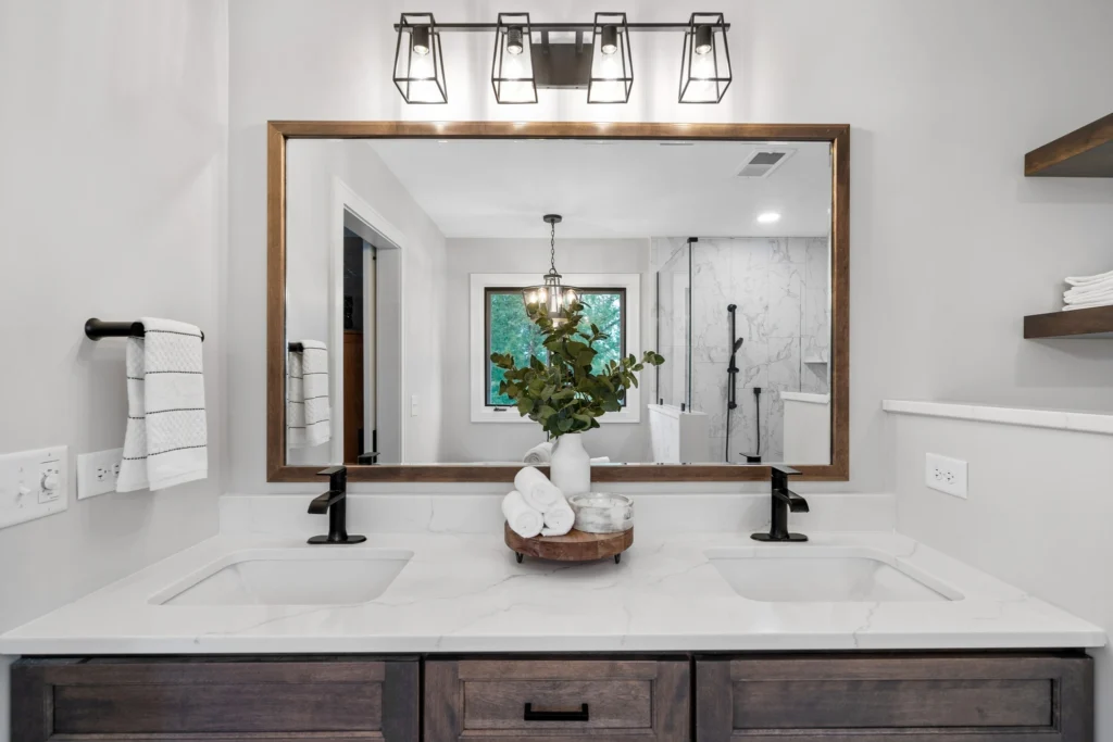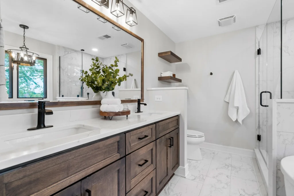 The heart of this project lies in the thoughtful selection of high-quality materials and design elements that create a harmonious balance of elegance and warmth. We introduced bright white quartz countertops and marble-inspired porcelain tiles for a clean, luminous backdrop, paired with warm wood-toned cabinets that add a touch of organic coziness. A sleek, modern freestanding tub became the focal point, complemented by a frameless glass shower enclosure that enhances the sense of openness. Beautiful matte black fixtures, including rainfall showerheads and vessel faucets, tie in with contemporary lighting—such as a statement chandelier and vanity sconces—that illuminate the space without overwhelming it. The flooring, upgraded to durable porcelain with subtle veining, ties everything together, ensuring durability and style that will endure for years.